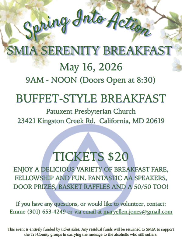 Click each Event Link Below to Jump to that Flyer Recurring Events Monthly SMIA Business Meeting Area 29 Accessibilities Committee Meeting Area 29 GSR Orientation Spring Contra Study Individual Events District 36 Corrections Workshop Basic Text Group 20th Annivesary SMIA Serenity Breakfast 2026 Maryland State Convention District 36 No Talent Talent Show 2026 VAC Convention