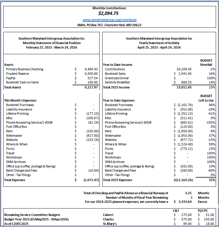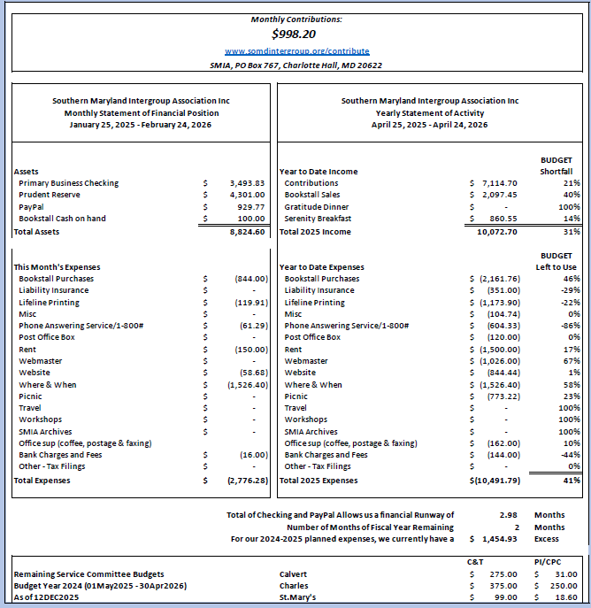 Southern Maryland Intergroup Association aids groups in carrying the A.A. message to the alcoholic who still suffers by: