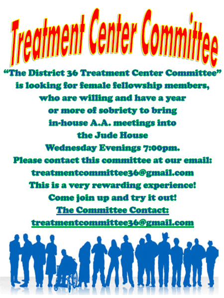 District Committee Member (DCM) David Y. dcm@calvertaa.org Alternate DCM Brian B. altdcm@calvertaa.org Secretary Lorraine J. secretary@calvertaa.org Treasurer Peggy R. treasurer@calvertaa.org Events Committee Chair Jerry C. events@calvertaa.org Corrections and Jails Daniel S. corrections@calvertaa.org Rehabs and Hospitals Peggy K. treatment@calvertaa.org Bridging the Gap Vacant Grapevine John B. grapevine@calvertaa.org Web and Communications Bill L. webmaster@calvertaa.org Intergroup Liaison Jamie R. igliaison@calvertaa.org Public Information Kenny G. pubinfo@calvertaa.org