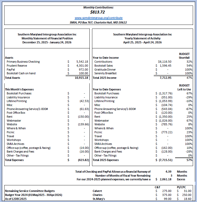 Southern Maryland Intergroup Association aids groups in carrying the A.A. message to the alcoholic who still suffers by: