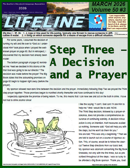 The LIFELINE is an informal, unofficial newsletter published by the membership of the Southern Maryland Intergroup Association, Inc.. Any opinions expressed are those of the editor or authors of submissions. They are not endorsed by SMIA, any group nor AA as a whole.
